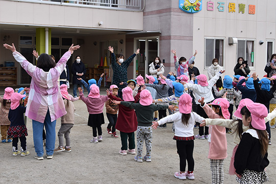前回同様にコロナ感染防止のため密を避け、2日に分けて最小人数、短時間で行いました。保育参観は保育園での日常生活をそのまま見て頂くので、当園の保育参観は特別な企画は一切行いません。朝当園したときの屋外での運動や遊びの様子、みんなそろって行う体操の様子、屋内での遊戯や学習の様子などを参観していただき、一部一緒に参加していただいたりもしました。